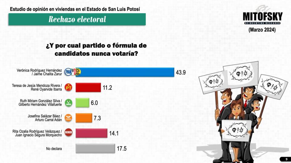 También en dicha encuesta vemos que hay un hartazgo, así como un “rechazo electoral” por los partidos y políticos de antes, como lo es la coalición del PRI PAN PRD, en donde vemos que hay personas que ya no creen en esa política vieja y llena de negocios turbios, y que incluso muchos “nunca votarían” por estos partidos y sus candidatos.