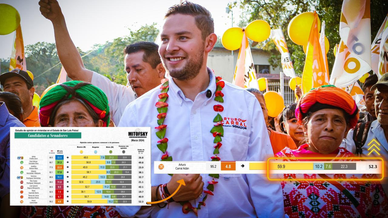 Y es que en una parte importante de la encuesta de Mitofsky, podemos apreciar de qué el Candidato al Senado Arturo Carral, es la posición número uno en cuanto que es “buen” candidato siendo esto la mayor calificación, con un 52.3% (59.9% de lo bueno (amarillo) menos los 7.6% de lo malo (verde)) de “Saldo de Opinión” sobre todas las candidaturas al Senado en el estado potosino.