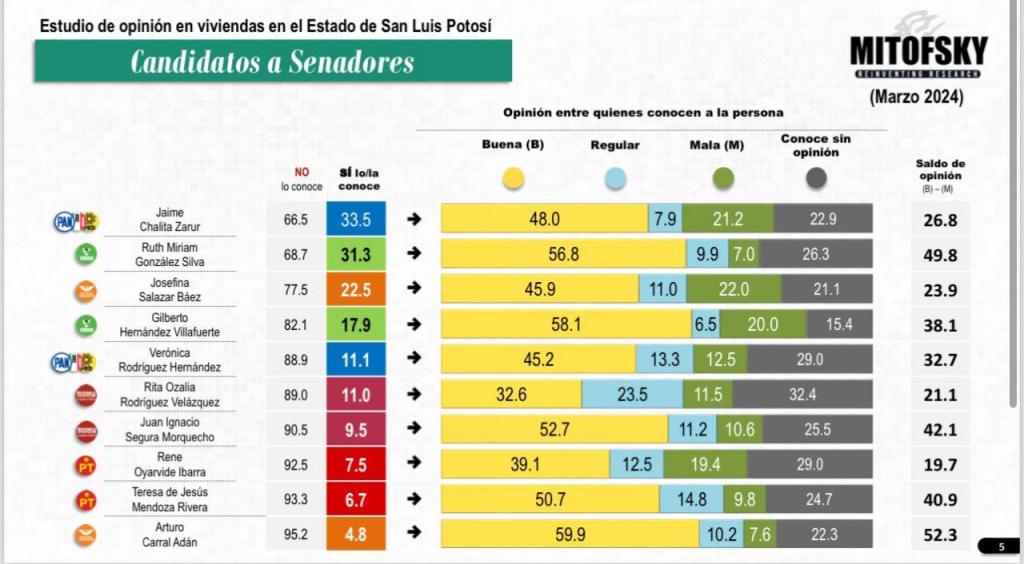 El saldo de opinión fue muy positivo en la consulta que realizó Mitofsky en SLP, lidereando con un 52.3% sobre todas las candidaturas al Senado en el estado potosino.