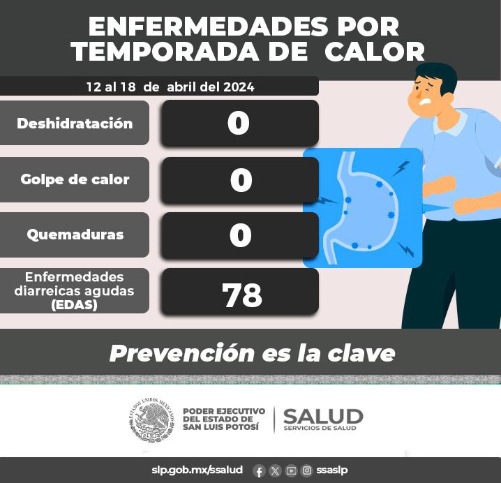 Del 12 al 18 de abril, los Servicios de Salud a través de la Subdirección de Epidemiología dan a conocer que 78 personas presentaron enfermedad diarreica aguda (EDAS); quienes presentaron enfermedades diarreicas se encuentran en un rango de edad de los 0 a los 89 años, 53 son mujeres y 25 hombres. No se registraron golpes de calor ni casos de deshidratación esta semana.