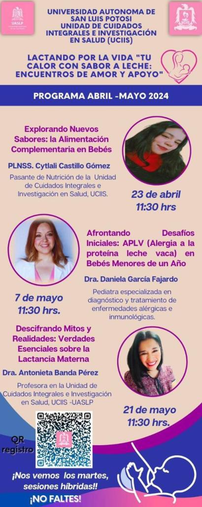 Mientras que el 07 de mayo se contará con la presencia de la doctora Daniela García Fajardo, quien es pediatra especializada en diagnóstico y tratamiento de enfermedades alérgicas e inmunológicas, el tema que abordará es “Afrontando desafíos iniciales: APLV (alergia a la proteína de la leche de vaca) en bebé menores de un año”. Para el 21 de mayo se presentará la conferencia “Descifrando los mitos y realidades: verdades esenciales sobre la lactancia materna”, que correrá por parte de la misma doctora Antonieta de Jesús Banda Pérez.