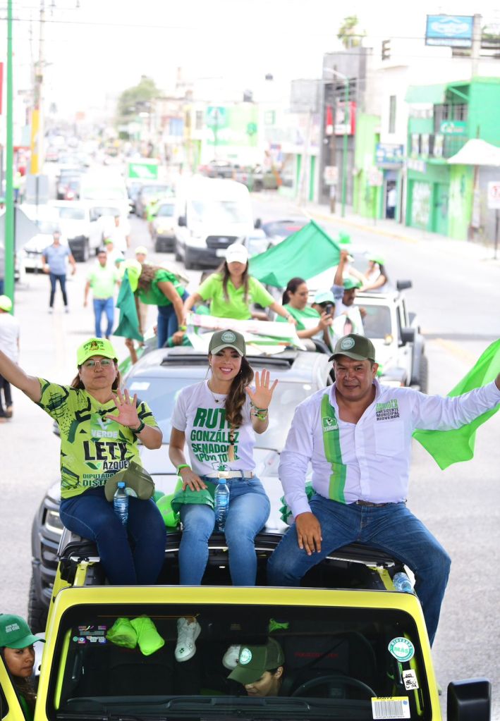 Por la mañana, Ruth González participó en una nutrida caravana con transportistas por las principales avenidas y calles de Rioverde al lado Arnulfo Urriola, candidato a la reelección a presidente municipal, donde hizo un llamado para que el próximo 2 de junio voten por las y los candidatos del Partido Verde, los únicos que han dado resultados y transformado la vida de las familias de las cuatro regiones del Estado.