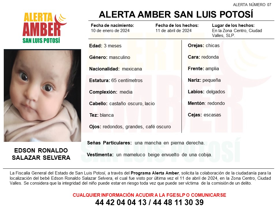 La Fiscalía General del Estado de San Luis Potosí (FGESLP) activó una Alerta Amber con el fin de localizar al bebé Edson Ronaldo Salazar Selvera de tres meses de edad, quien se le vio por última vez en la Zona Centro de Ciudad Valles.