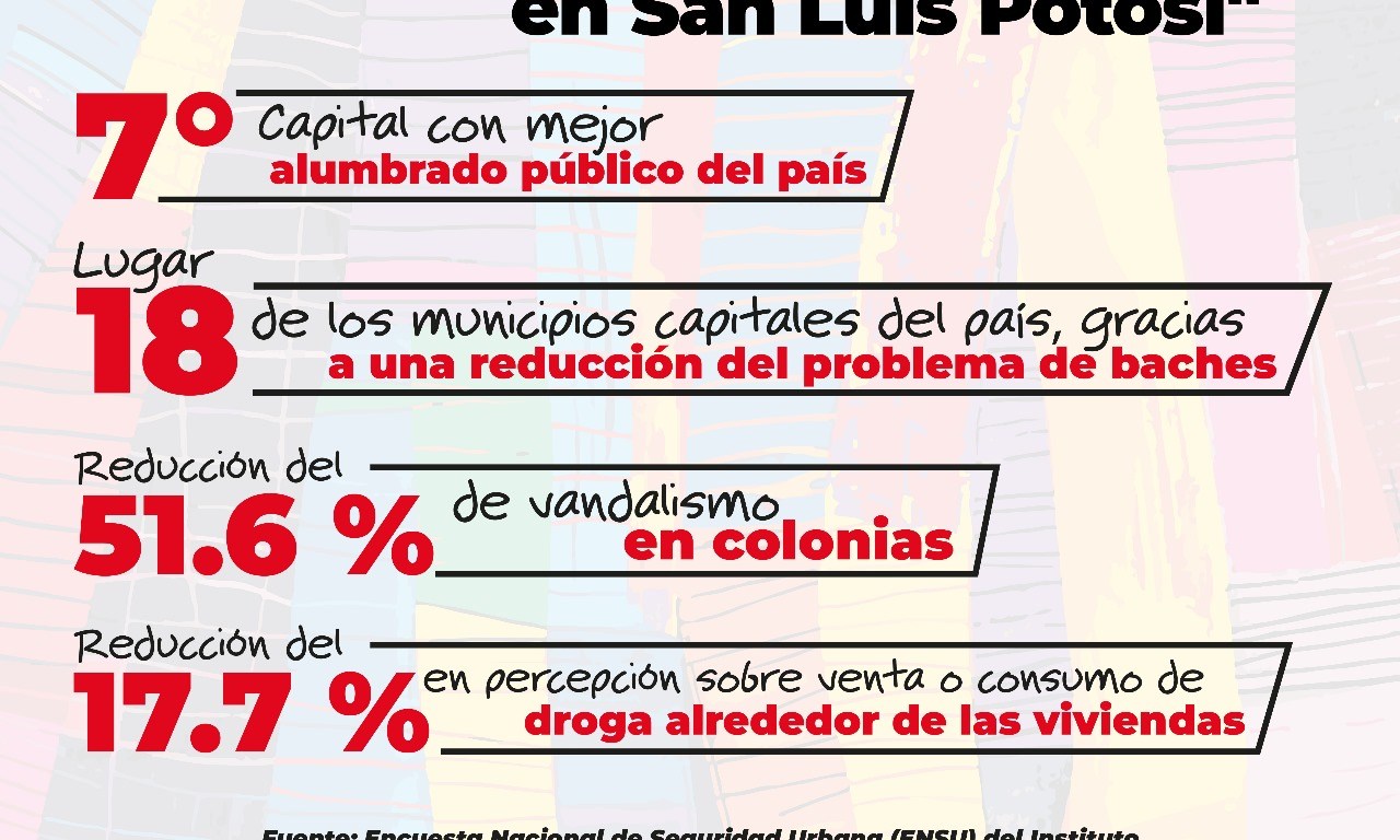 La Encuesta Nacional de Seguridad Urbana que realiza el Inegi, en sus resultados del primer trimestre del año, ubican a la capital como la séptima ciudad mejor iluminada del país, se ha reducido significativamente el problema de los baches, entre otros resultados en San Luis Potosí.
