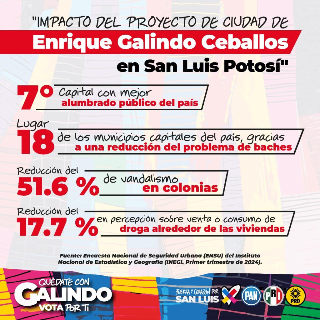 La Encuesta Nacional de Seguridad Urbana (ENSU) que realiza cada trimestre el Instituto Nacional de Estadística y Geografía (Inegi) constata que el proyecto de ciudad impulsado por Enrique Galindo Ceballos ha reducido de manera firme los problemas de alumbrado público, baches y conflictos vecinales en las colonias de la Capital.