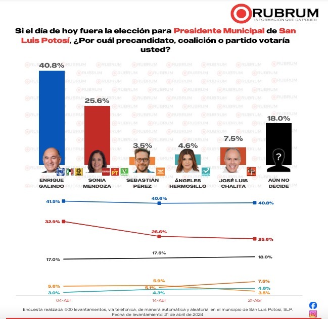Si el día de hoy fuera la elección para presidente municipal de San Luis Potosí, el candidato de la coalición Fuerza y Corazón por San Luis, Enrique Galindo Ceballos, ganaría con una diferencia de más de 15 puntos porcentuales, de acuerdo a los resultados que arrojó la encuesta realizada el pasado 21 de abril de 2024, por la casa encuestadora Rubrum.
