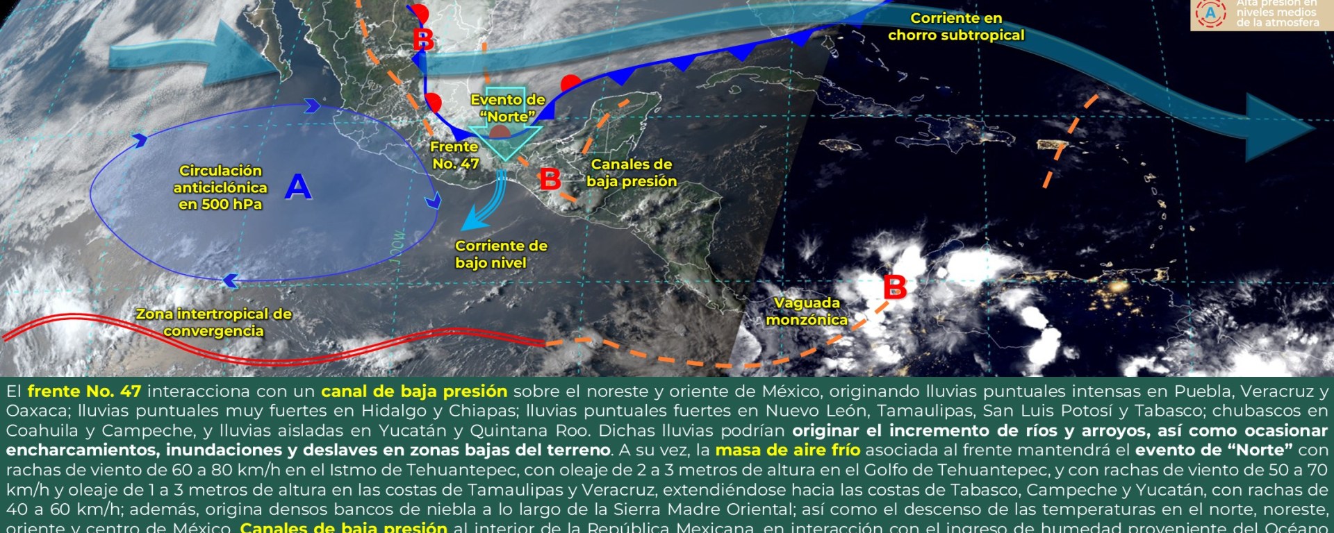 Viento de componente norte con rachas de 50 a 70 km/h, disminuyendo durante la noche en el Istmo de Tehuantepec; y con oleaje de 2 a 3 metros de altura: Golfo de Tehuantepec.