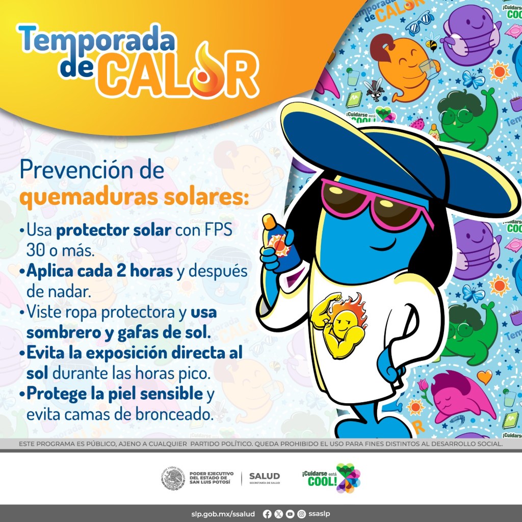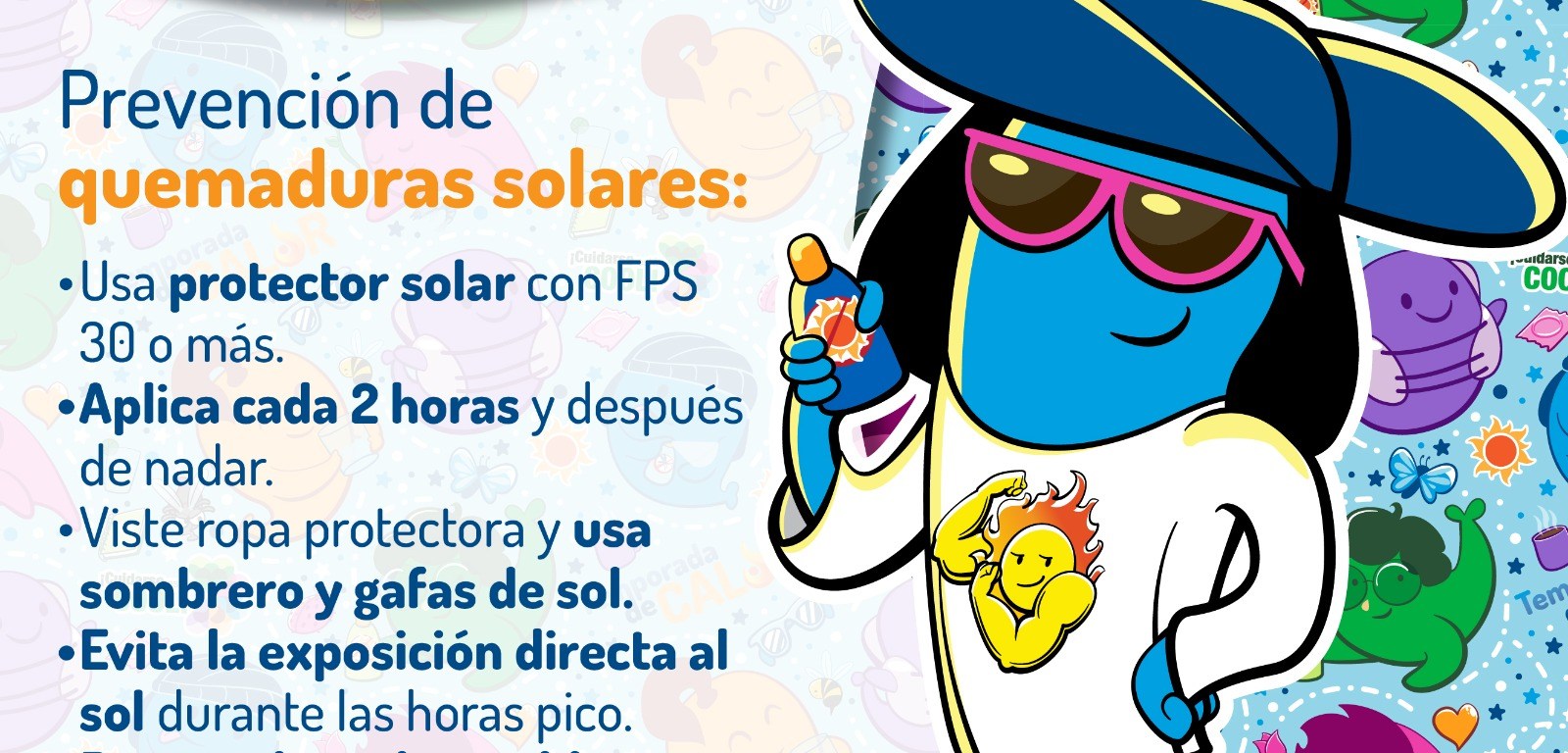 El cuidar nuestra salud en esta temporada es fundamental, no te expongas al sol durante las horas de calor más intenso entre las 11:00 y las 16:00 horas. En lo posible, opta por reducir actividades que pongan en riesgo la salud propia, familiar, comunitaria o escolar. Algunos posibles riesgos por las altas temperaturas son la deshidratación, diarreas, quemaduras por la exposición al sol, picaduras de animales y golpes de calor.