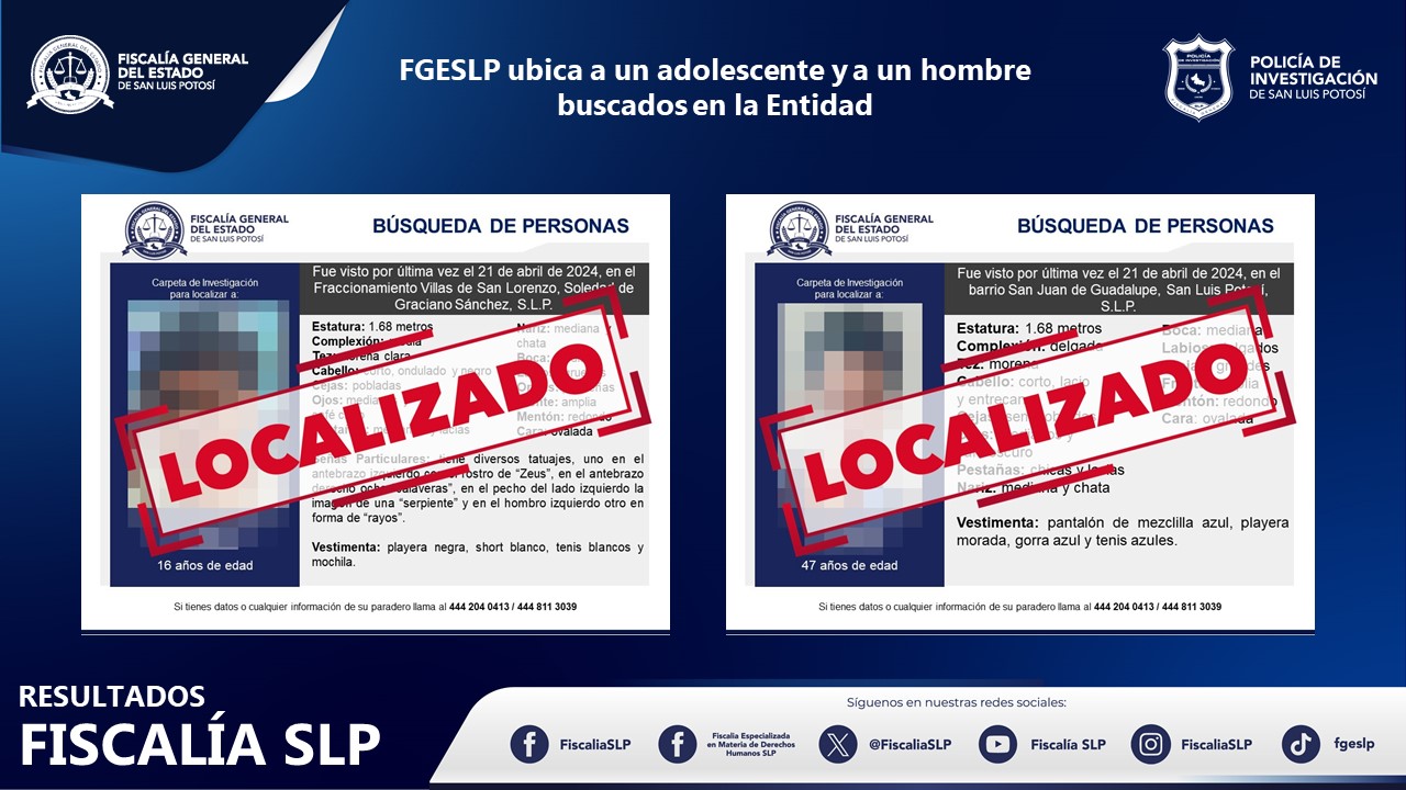 La Fiscalía General del Estado de San Luis Potosí (FGESLP) informó la localización de dos personas para las cuales se activó el protocolo homologado de búsqueda en Soledad de Graciano Sánchez y la Capital potosina.