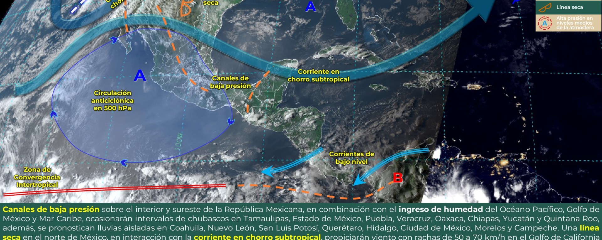 Viento con rachas de 40 a 60 km/h: Golfo de California, Campeche y Yucatán; con posibles tolvaneras: Sinaloa, Nayarit, Guanajuato, Querétaro, Hidalgo, Oaxaca, Chiapas y Tabasco.