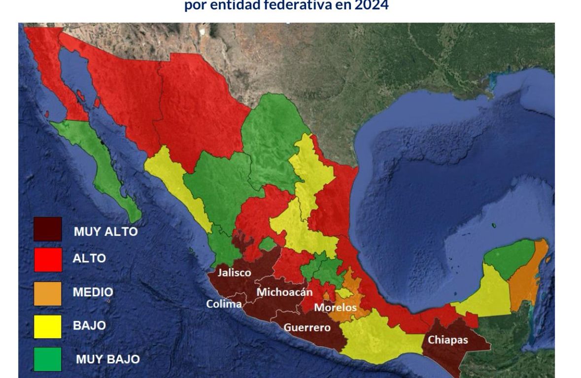 Son 15 las entidades las que enfrentan un riesgo muy alto de intromisión del crimen organizado en sus procesos electorales: Jalisco, Michoacán, Guerrero, Colima, Chiapas y Morelos; en riesgo alto están Baja California, Sonora, Chihuahua, Tamaulipas, Zacatecas, Guanajuato, Tabaco, Edomex y Veracruz.