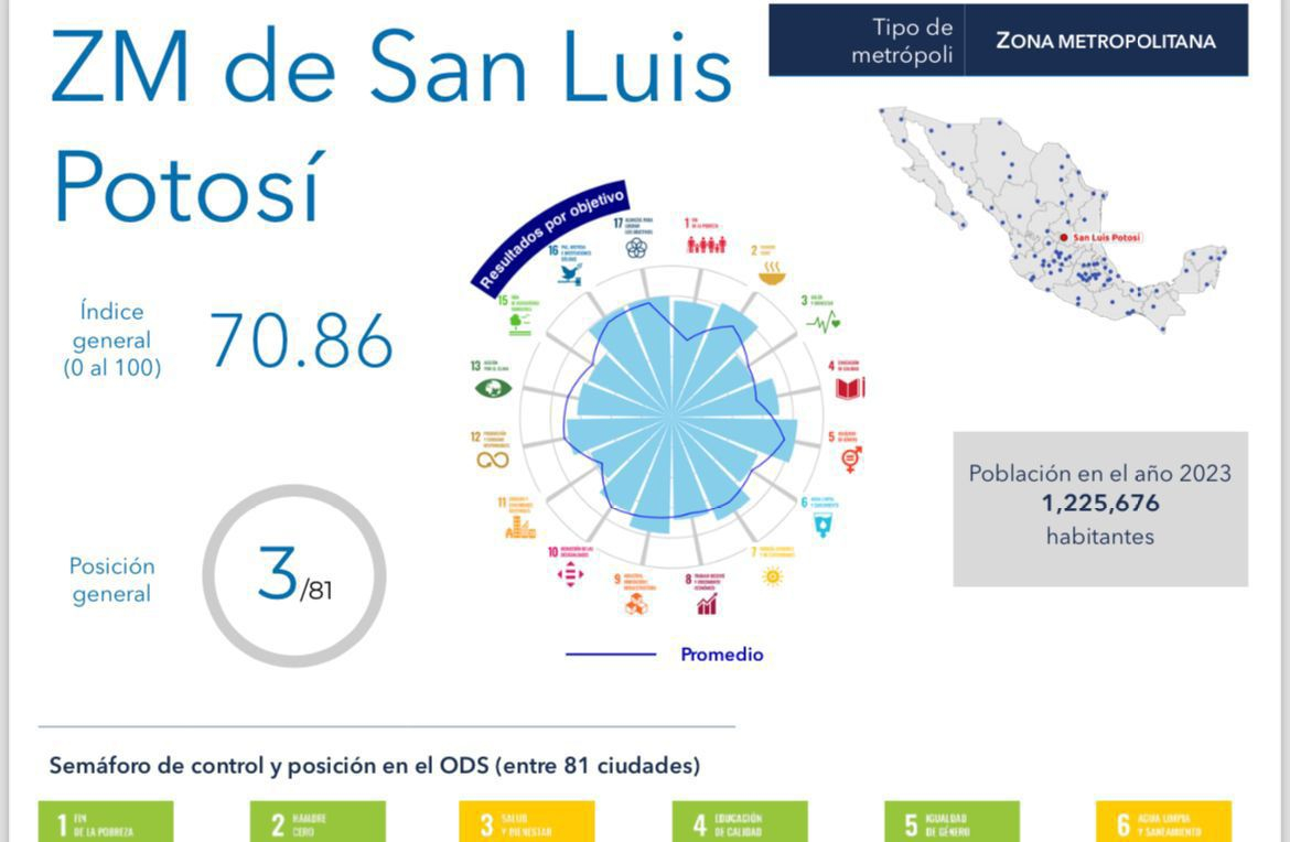 El Instituto Mexicano para la Competitividad -IMCO-, dio a conocer que la zona metropolitana de San Luis Potosí, encabezada por la Capital potosina ascendió hasta el tercer lugar en la medición de Ciudades Sostenibles, debido a los avances considerables en el cumplimiento de los Objetivos de Desarrollo Sostenible de la Agenda 2030 de la ONU.