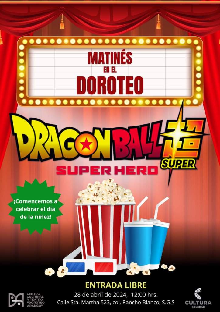 Para iniciar los festejos, este domingo 28 de abril a las 12 del día, el Centro Cultural y Teatro Doroteo Arango abrirá sus puertas para recibir a las familias soledenses en una matiné especial de cine, donde la película «Dragon Ball Super Hero» será la protagonista de esta función, ofreciendo entretenimiento para todos los niños y niñas que deseen asistir, con entrada libre, informó la Dirección de Cultura.