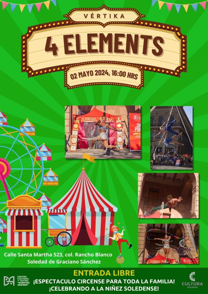 Asimismo, el jueves 2 de mayo a las 16:00 horas, se invita al gran espectáculo de danza aérea por parte del grupo Vértika “4 Elements”, que ofrecerá momentos inolvidables para las y los chiquitines. La ubicación de “Doroteo Arango” es en calle Santa Martha en la colonia Rancho Blanco, a unos metros del Circuito Potosí y su cruce con avenida San Pedro.