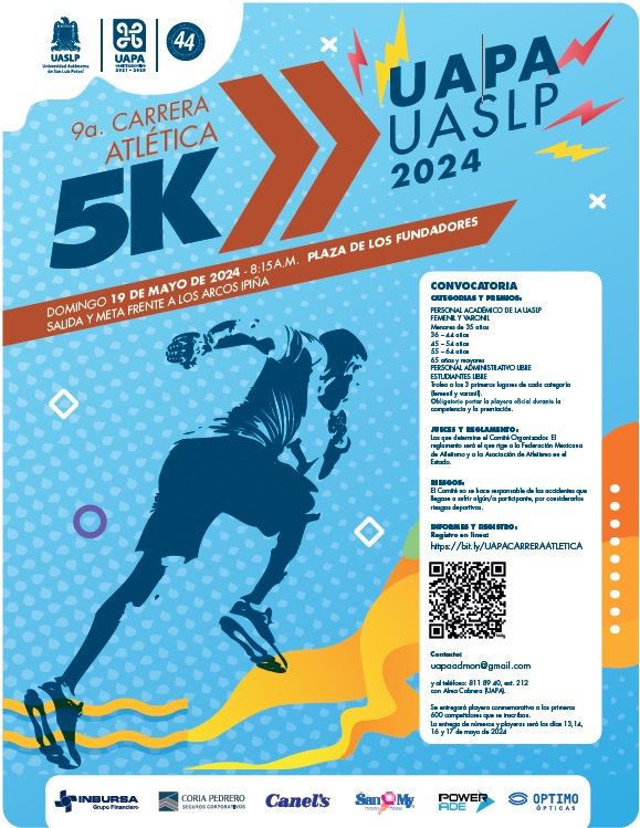 La Unión de Asociaciones de Personal Académico (UAPA) de la Universidad Autónoma de San Luis Potosí, invita a toda la comunidad docente a participar en la novena edición de su ya tradicional Carrera Atlética 5K, la cual tendrá lugar el domingo 19 de mayo de 2024, teniendo como salida y meta Los Portales Ipiña, Plaza de los Fundadores.