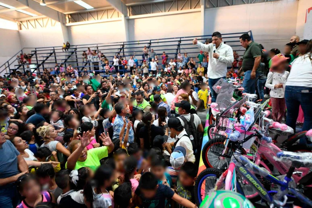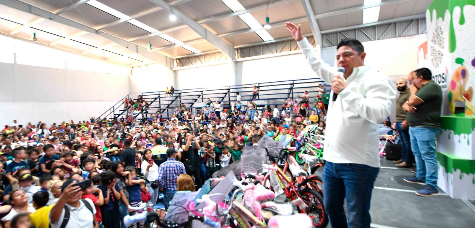 Por la mañana, en Villa de Ramos, previo al arranque del nuevo camino Dulce Grande a Noria del Gato, el Gobernador también entregó a las y los niños de este municipio del Altiplano regalos y bicicletas, con lo que las y los menores disfrutarán más de su infancia.