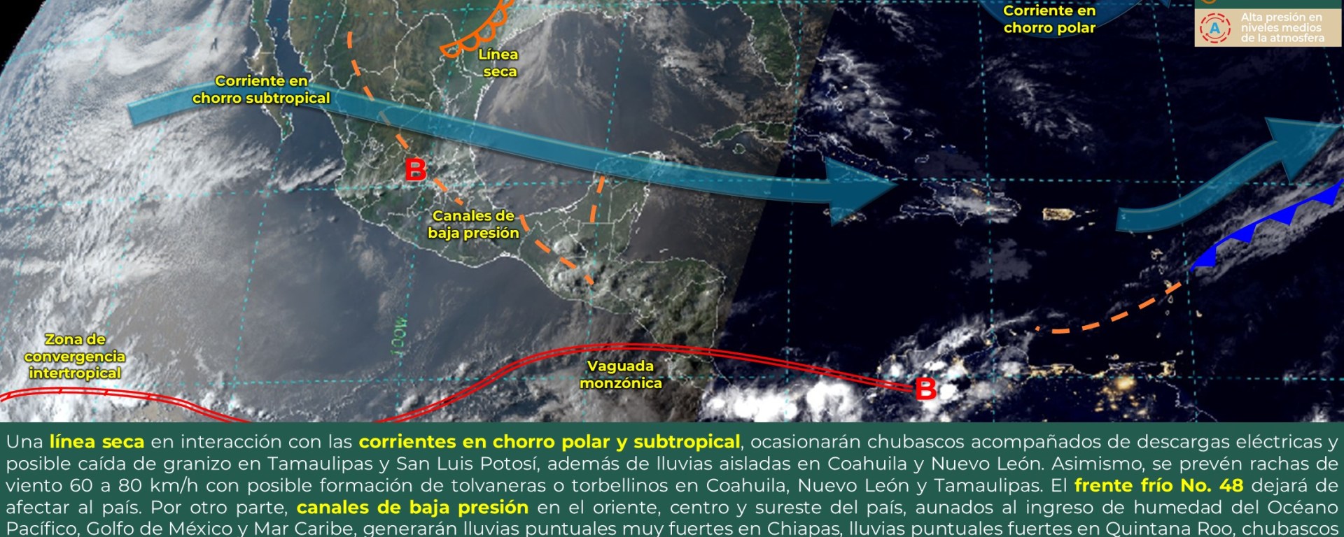 Viento con rachas de 40 a 60 km/h: Guerrero, Oaxaca, Veracruz, Chiapas, Tabasco, Campeche, Yucatán y Quintana Roo; con posibles tolvaneras: Chihuahua, Durango, San Luis Potosí, Aguascalientes, Michoacán, Guanajuato, Querétaro, Hidalgo, Estado de México, Ciudad de México, Puebla y Tlaxcala.