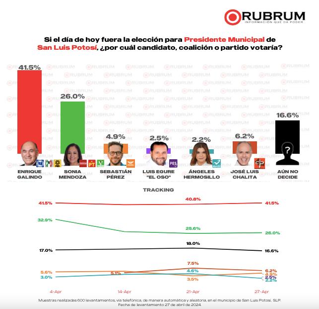 Luis Alberto García, Director General de la casa encuestadora Rubrum, dio a conocer los resultados de la última encuesta aplicada en el municipio de San Luis Potosí, en la que el candidato de la coalición Fuerza y Corazón por San Luis, Enrique Galindo Ceballos, tiene una amplia ventaja, de acuerdo con el estudio de este 29 de abril.