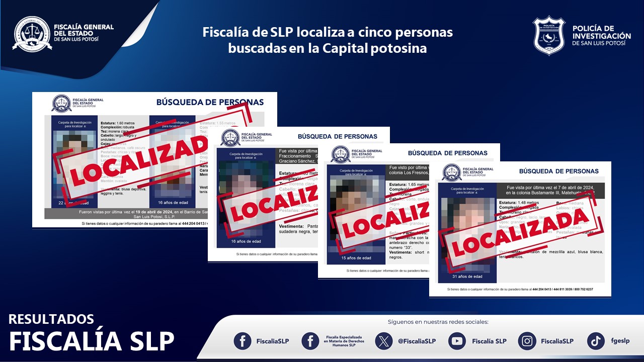 A través de distintas acciones, cinco personas que eran buscadas en territorio potosino fueron encontradas por agentes de la Dirección General de Métodos de Investigación (DGMI), informó la Fiscalía General del Estado de San Luis Potosí (FGESLP).