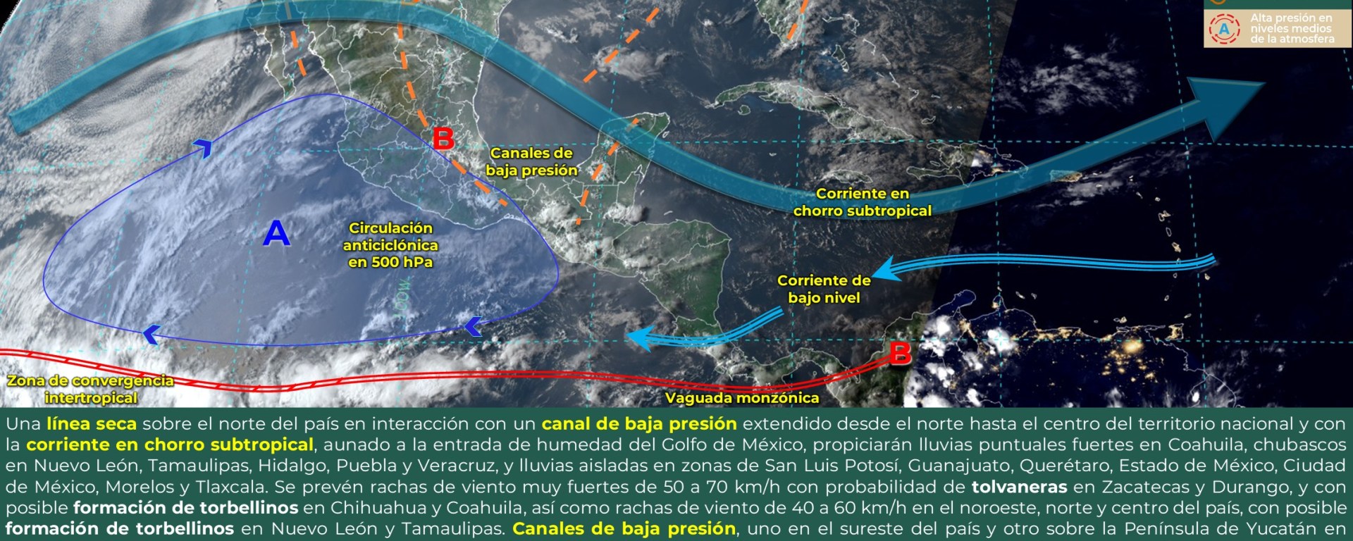 Viento de componente sur (surada) con rachas de 60 a 70 km/h y posible formación de torbellinos o tornados: Coahuila, Nuevo León y Tamaulipas; con rachas de 40 a 60 km/h: Veracruz.