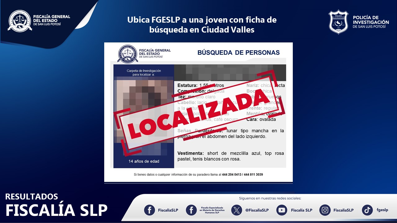 La Fiscalía General del Estado de San Luis Potosí (FGESLP) informó la localización de Danna, una adolescente de 14 años, para quien se activó el protocolo homologado de búsqueda en Ciudad Valles.