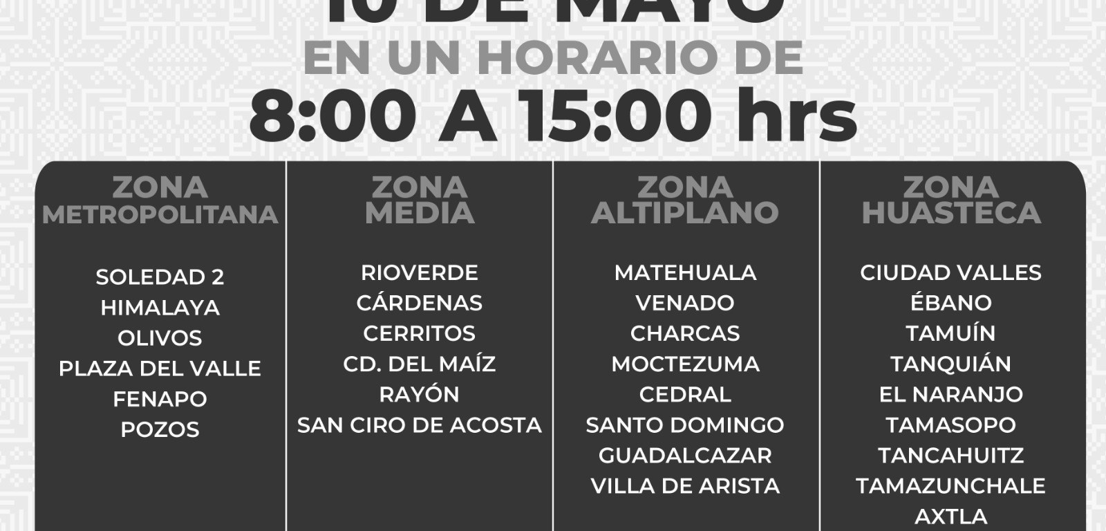 El Poder Ejecutivo del Estado, a través de la Secretaría de Finanzas (Sefin) y Oficialía Mayor, informó que este viernes 10 de mayo, el servicio y la atención a la ciudadanía se mantendrá activo en las oficinas estatales, en 29 recaudadoras de las cuatro regiones y el módulo de la Feria Nacional Potosina (Fenapo), en un horario de 8:00 a 15:00 horas, debido a que las trabajadoras de base estatales gozarán de un día de descanso, con motivo del Día las Madres.