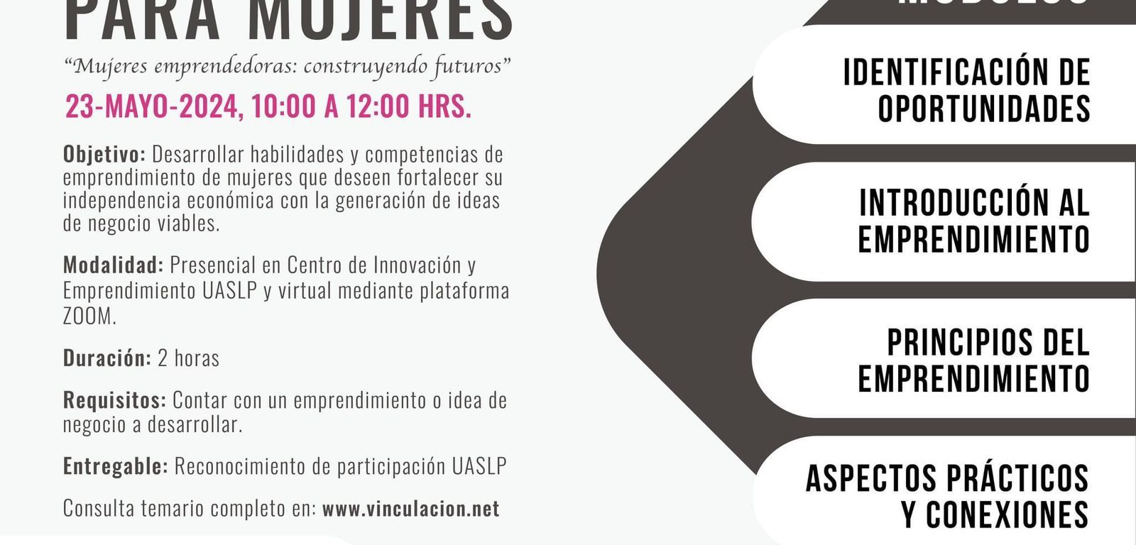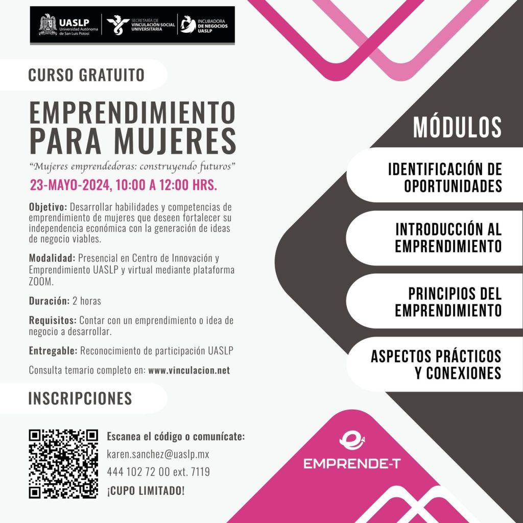 La Secretaría de Vinculación Social Universitaria impartirá este jueves 23 de mayo, el curso Emprendimiento para mujeres “Mujeres emprendedoras: construyendo futuros”, en un horario de 10:00 a 12:00 horas, en el Centro de Innovación y Emprendimiento UASLP, bajo la modalidad presencial y virtual mediante plataforma Zoom.