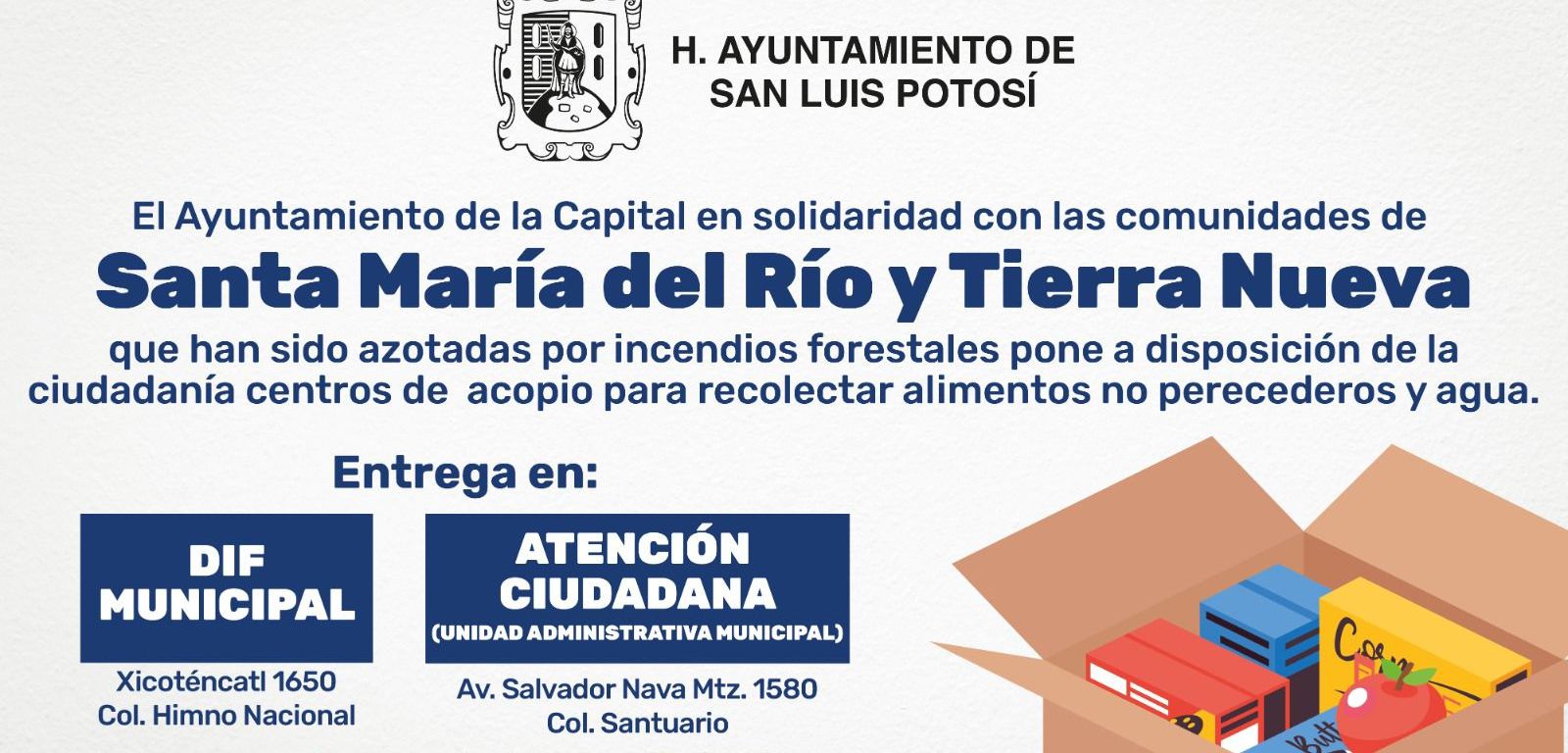 El Gobierno de la Capital, da a conocer que abrió dos centros de acopio para que las potosinas y potosinos donen alimentos no perecederos y agua embotellada, en favor de los habitantes de Santa María del Río y Tierra Nueva, quienes se han visto afectados por los recientes incendios forestales.