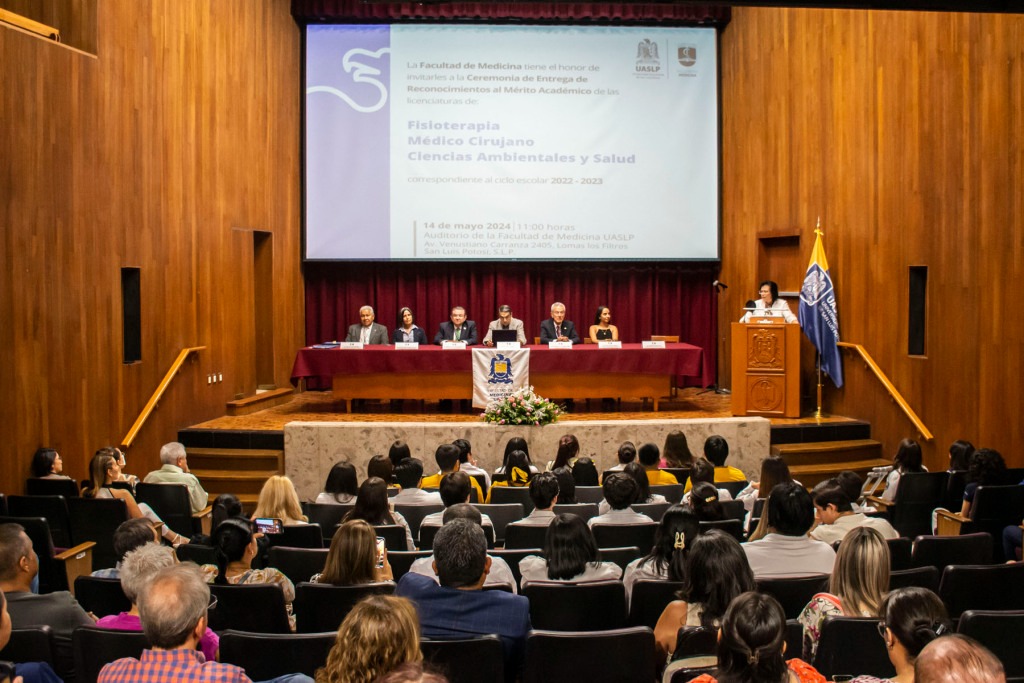 Este día se llevó a cabo la ceremonia de entrega de reconocimientos al Mérito Académico para 40 estudiantes de las licenciaturas de Médico Cirujano, Fisioterapia y Ciencias Ambientales y Salud, de la Facultad de Medicina de la Universidad Autónoma de San Luis Potosí (UASLP), correspondientes al ciclo escolar 2022-2023.