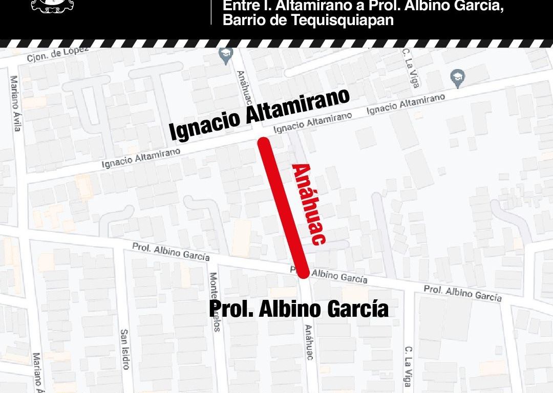Con el propósito de continuar la rehabilitación de las vialidades de la ciudad, el Gobierno Municipal de San Luis Potosí, a través de la Dirección de Obras Públicas, informa a la ciudadanía que será cerrada la circulación de la calle Anáhuac, en el tramo de Ignacio Altamirano a prolongación Albino García en el Barrio de Tequis.