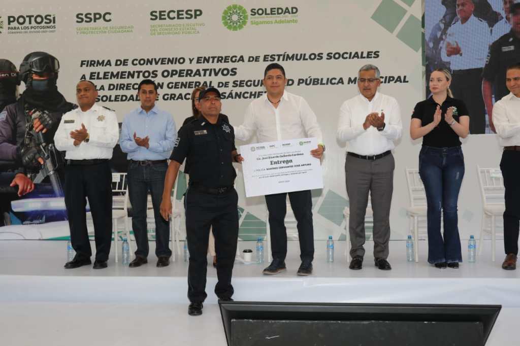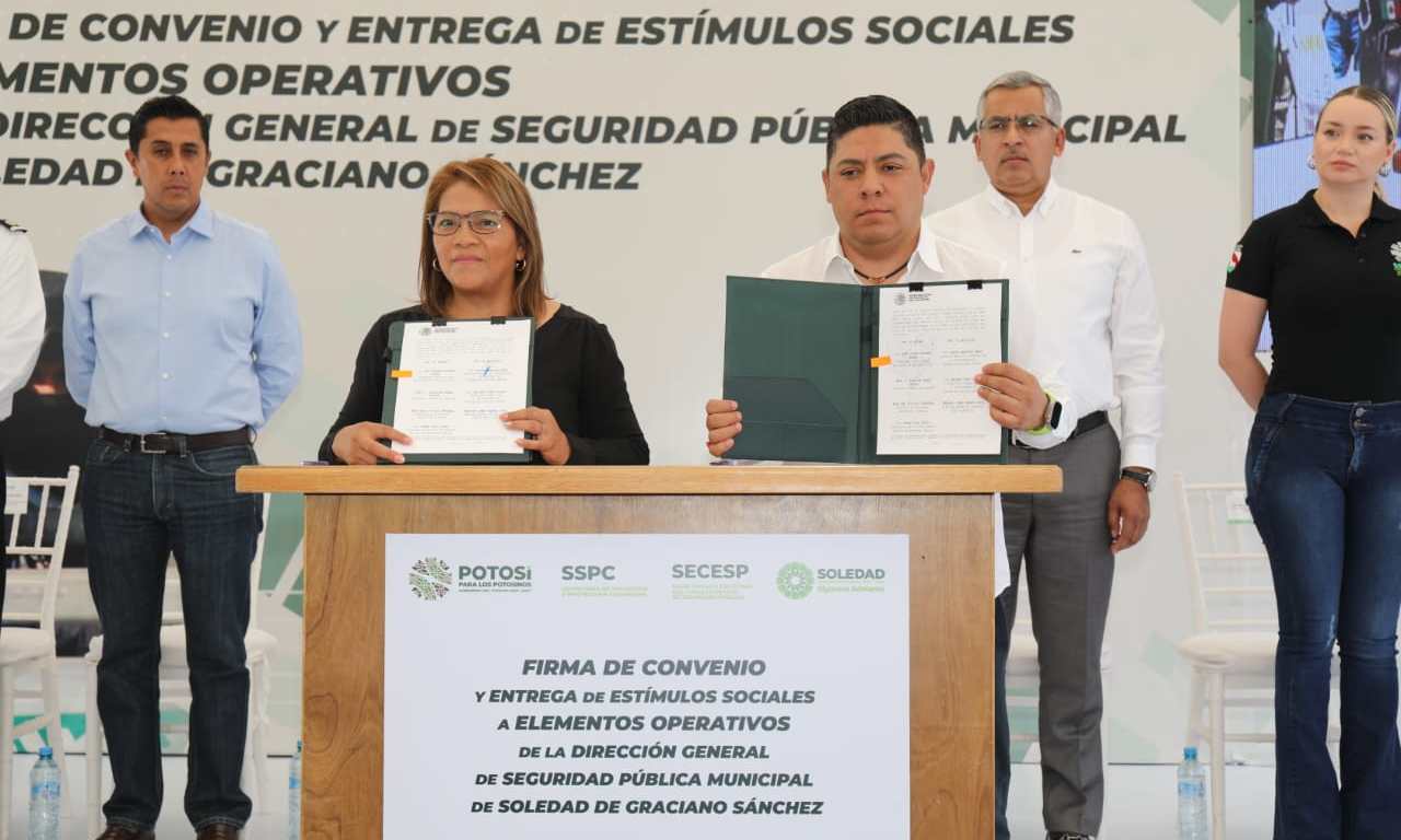 Para seguir garantizando la paz y tranquilidad a las familias de Soledad de Graciano Sánchez, este miércoles el Titular del Poder Ejecutivo del Estado, Ricardo Gallardo Cardona, realizó una firma de convenio y entrega de estímulos sociales a las y los elementos operativos de la Dirección General de Seguridad Pública Municipal (DGSPM).