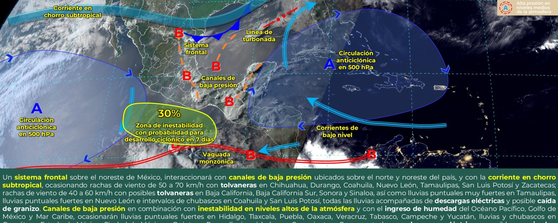 Viento con rachas de 50 a 70 km/h y tolvaneras: Baja California, Chihuahua, Durango, Zacatecas y San Luis Potosí; con posible formación de torbellinos: Coahuila.