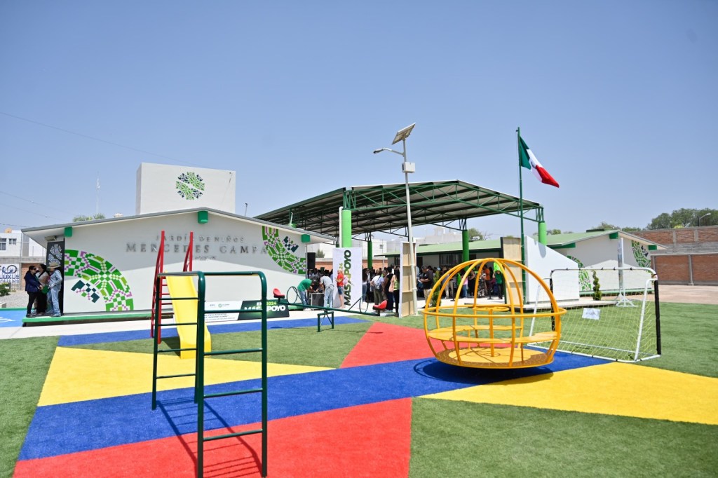 En el Jardín de niños “Mercedes Campa” ubicado en el fraccionamiento El Toro, el Mandatario entregó a la comunidad educativa tres aulas didácticas, pintura en el edificio, conexiones eléctricas, rehabilitación de la plaza cívica y estacionamiento, así como una barda perimetral, área de juegos infantiles y obras complementarias, fortaleciendo las acciones a favor de la educación de las nuevas generaciones, tras un largo proceso de abandono de la herencia maldita.
