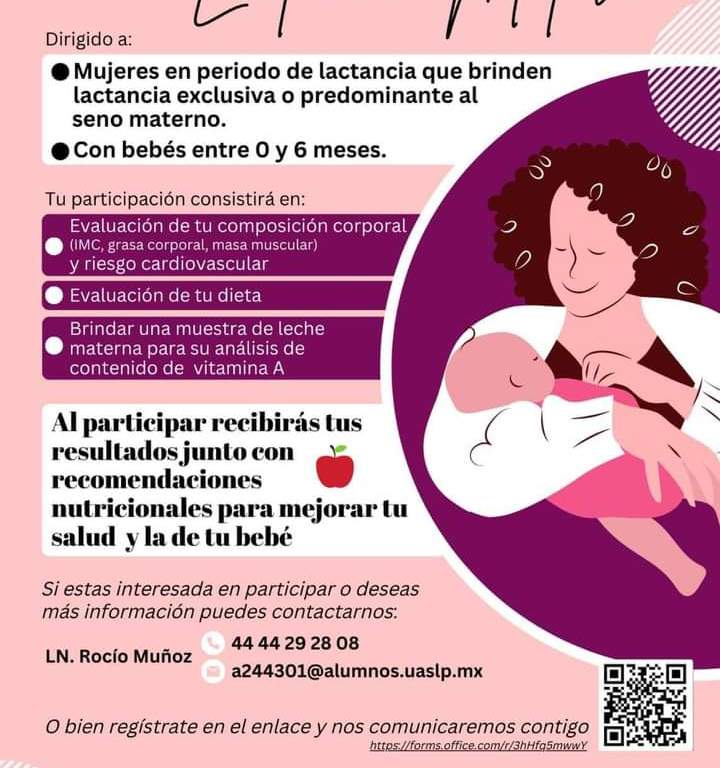Las interesadas en formar parte de esta investigación, pueden regístrarse en el siguiente enlace https://forms.office.com/r/3hHfq5mwwY o comunicarse directamente con la L.N. Rocío Muñoz al número: 4444292808.