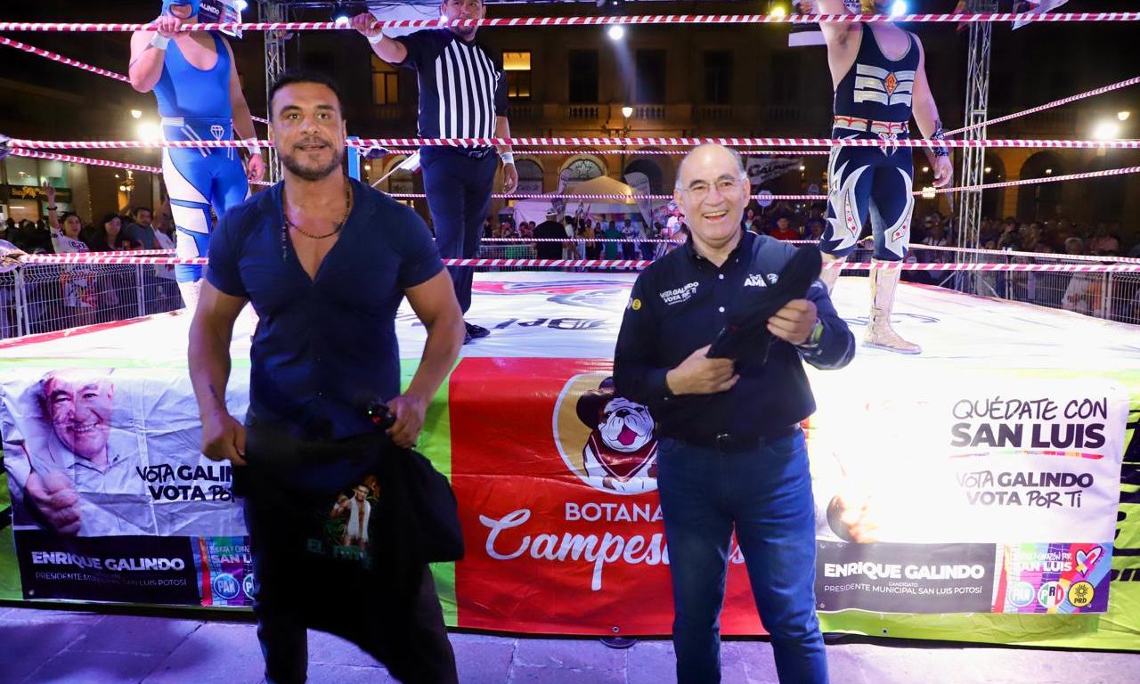 El candidato a la alcaldía por la coalición conformada por PAN, PRI y PRD, Enrique Galindo Ceballos, se comprometió a dar continuidad a las acciones de impulso al deporte en todos los niveles, principalmente el popular, con actividades gratuitas, como la función de lucha libre que ofreció ayer por la tarde en la Plaza de los Fundadores, estelarizada por Alberto El Patrón, el mejor luchador potosino de los últimos años; Metalik, triunfador en México, Estados Unidos y Japón; y lo mejor de la baraja luchística en San Luis Potosí; quienes deleitaron con un espectáculo gratuito y de gran calidad a miles de aficionados reunidos en la Plaza de los Fundadores.