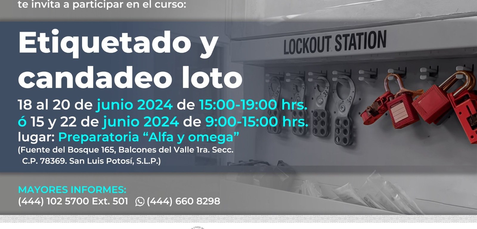 Como parte de la amplia oferta de profesionalización para que las y los potosinos accedan a empleos mejor pagados y formen parte del desarrollo económico que impulsa el Poder Ejecutivo del Estado, el Instituto de Capacitación para el Trabajo (Icat), invita a participar en el curso “Etiquetado y candadeo LOTO” para el bloqueo y señalización de equipo industrial en trabajos de mantenimiento o reparación.
