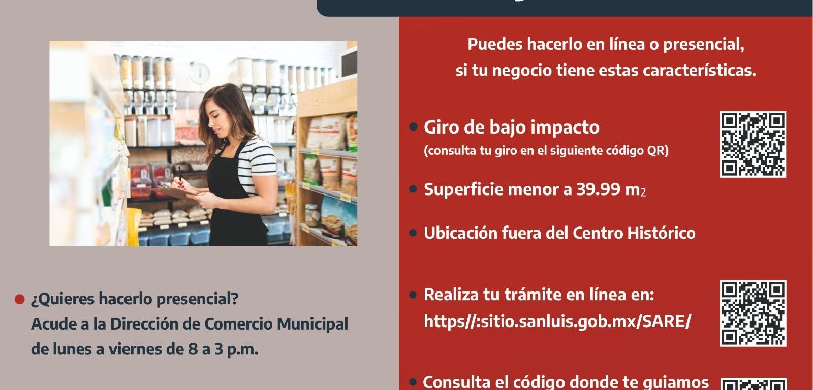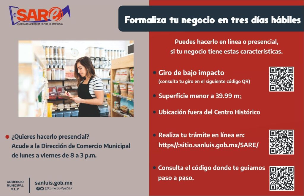 El gobierno municipal de San Luis Potosí informa a la población en general que el SARE es el Sistema de Apertura Rápida de Empresas actualizado, que tiene la finalidad de agilizar trámites para la apertura de negocios de bajo impacto. El SARE brinda a la ciudadanía herramientas para evitar actos de corrupción, y la Licencia cuenta con sellos de luz ultravioleta para mayor seguridad. Este sistema permite realizar el procedimiento de manera sencilla para obtener la Licencia de Funcionamiento y Uso de Suelo en tres días.