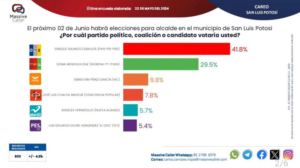 La encuesta de Massive Caller le da al candidato de la alianza PAN, PRI y PRD un total de 41.8 por ciento de preferencia entre la población capitalina, mientras que el segundo lugar lo ocupa Sonia Mendoza, con 29.5 por ciento. El resto de los aspirantes a la presidencia municipal de San Luis Potosí tienen menos de un 10 por ciento de preferencias.