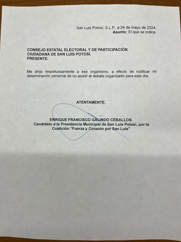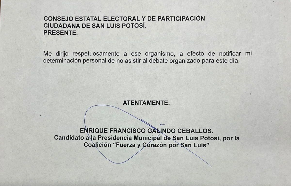Dado que yo esperaba un ejercicio en el que prevalecieran el contraste de ideas y las propuestas y no una celada como punto culminante de una guerra sucia, que arrancó incluso antes del primer minuto de campaña, que ahora sé, fue impulsada por la campaña de Sonia Mendoza, decidí no acudir al debate al cual convocó el Consejo Estatal Electoral y de Participación Ciudadana, dijo el candidato de la coalición Fuerza y Corazón por San Luis, Enrique Galindo Ceballos.