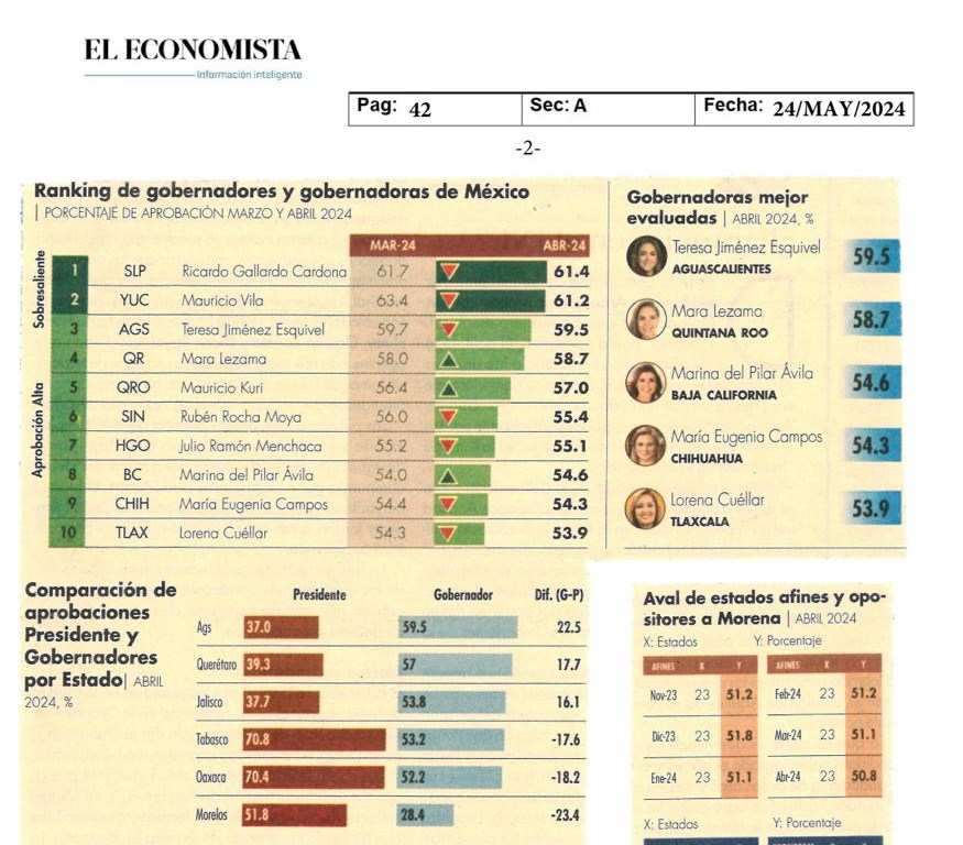 En el estudio correspondiente al mes de abril de 2024, Gallardo Cardona, obtuvo 8.9 puntos porcentuales más que el promedio de las y los Gobernadores que fue de 52.5 por ciento, además de que logró posicionar a San Luis Potosí entre las únicas dos entidades con calificación sobresaliente, a través de un porcentaje mayor del 60 por ciento de aval ciudadano.