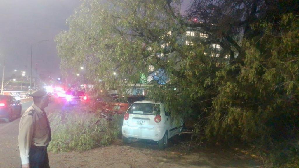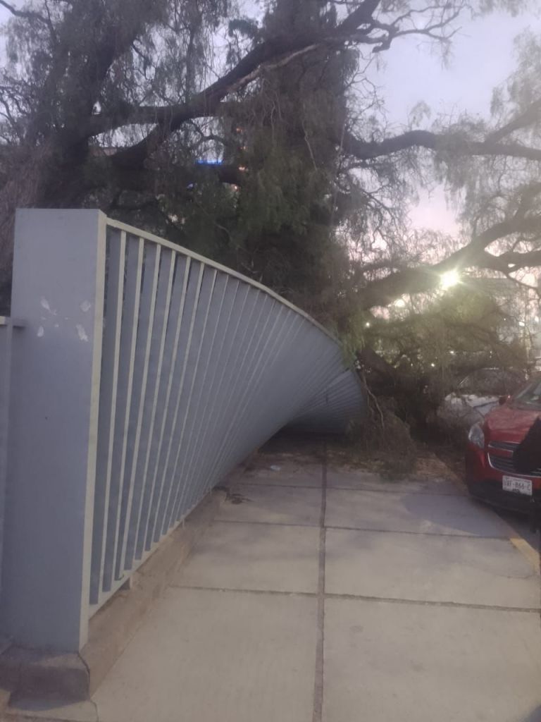 Esta tarde de viernes 24 de mayo debido a fuertes vientos que se registraron en la zona, se cayó un árbol de la Facultad de Medicina de la UASLP, el cual dañó la reja así como un vehículo que pertenece a un trabajador universitario.
