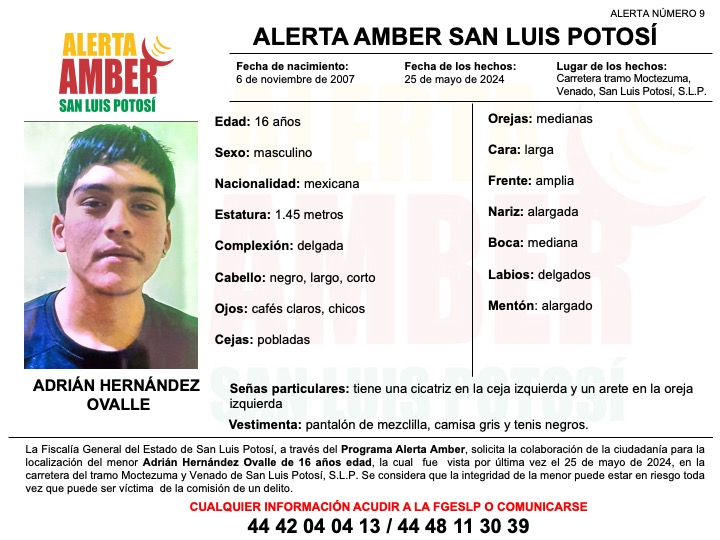 La Fiscalía General del Estado de San Luis Potosí (FGESLP) activó una alerta amber para la localización de Adrián Hernández Ovalle, quien fue visto por última vez en la carretera que va de Moctzuma a Venado.