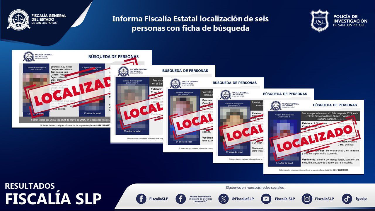 La Fiscalía General del Estado de San Luis Potosí (FGESLP) a través de la Policía de Investigación (PDI) localizó a seis personas que contaban con ficha de búsqueda en territorio potosino.