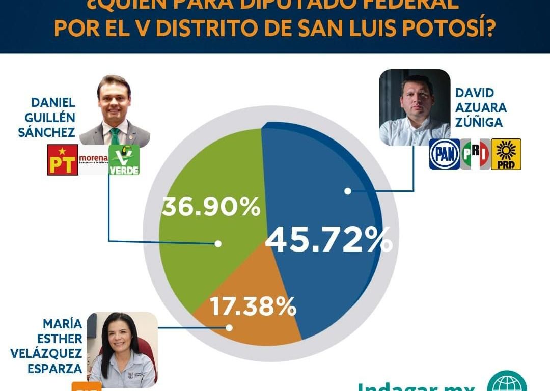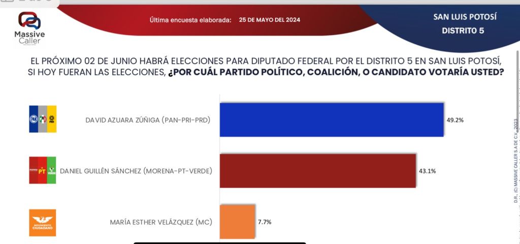En la carrera a la diputación federal por el Distrito 05, la última encuesta elaborada por Massive Caller, refleja una intención del voto del 49.2 por ciento para David Azuara Zúñiga, candidato del PAN – PRI – PRD, mientras que el candidato del Partido Verde, Morena y del Trabajo, alcanzó el 43.1 por ciento de las preferencias.