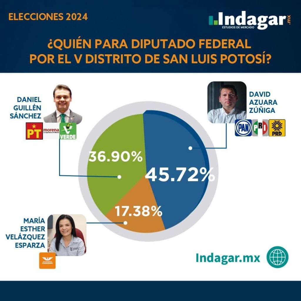 En lo que respecta a Indagar Estudios, proyecta a David Azuara como virtual ganador de la elección a Diputado Federal, dando a conocer que tiene el 45.7 por ciento de las preferencias electorales, mientras que Daniel Guillén Sánchez, quién obtuvo 36.9 por ciento de favoritismo ciudadano.