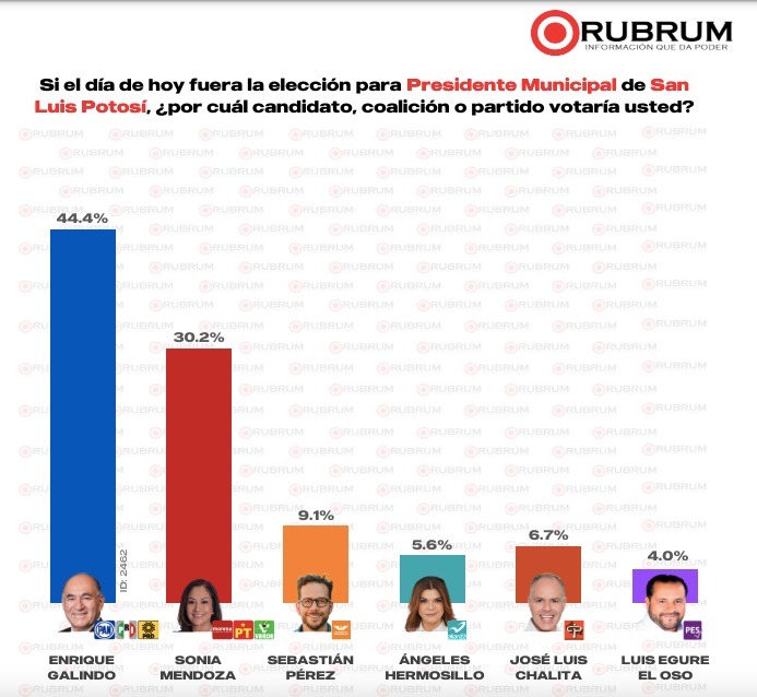 Enrique Galindo tiene 44.4 por ciento de preferencias electorales y una ventaja de 14.2 puntos sobre el segundo lugar, de acuerdo con la más reciente encuesta de Rubrum publicada este lunes 27 de mayo: “Las cosas van a seguir como hasta ahorita han manifestado los potosinos en la elección de alcalde en San Luis Potosí”, explicó Luis Alberto García .