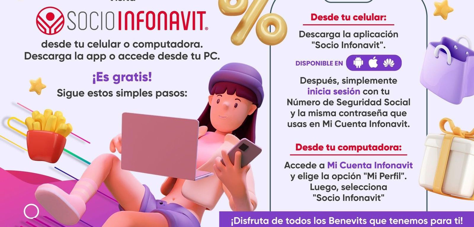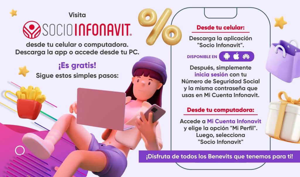 Únete a la comunidad de Socio Infonavit y disfruta descuentos y beneficios exclusivos. Solo necesitas tu Número de Seguridad Social (NSS) y tu contraseña de Mi Cuenta Infonavit. Descarga la aplicación o regístrate hoy mismo en app.socioinfonavit.com.