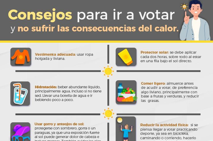 Para evitar golpes de calor o cuadros de deshidratación, solicitó reducir la actividad física como acudir caminando a las urnas durante el horario de mayor calor, de las 12:00 a las 16:00 horas; a las madres y padres que acudirán con menores, evitar dejarlos en el vehículo, mantenerlos en la sombra e hidratarlos frecuentemente y finalmente a las y los funcionarios de casilla y observadores, mantener espacios ventilados, llevar un abanico manual de preferencia y abundante agua.