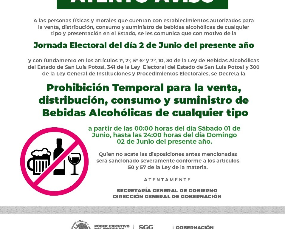Dijo que la Dirección General de Gobernación implementará operativos especiales en tres turnos para hacer cumplir esta disposición por lo que invitó a las y los dueños y administradores de negocios con venta de bebidas alcohólicas para que respeten la Ley Electoral de San Luis Potosí, la cual señala en su artículo 341, que “El día de la jornada electoral y el anterior, queda prohibida la venta de bebidas alcohólicas, y deberán permanecer cerrados todos los establecimientos que expidan esta clase de bebidas como actividad principal…”.