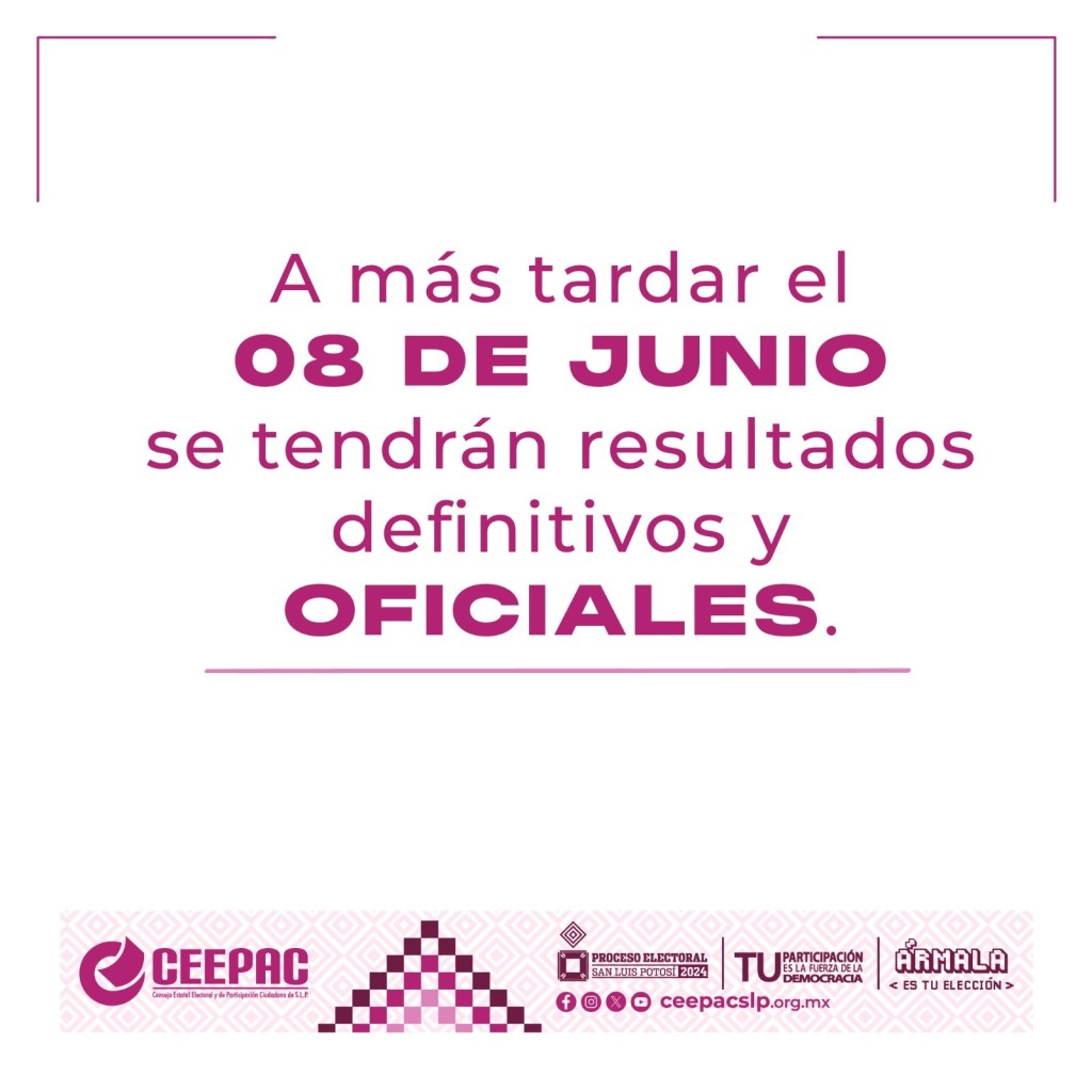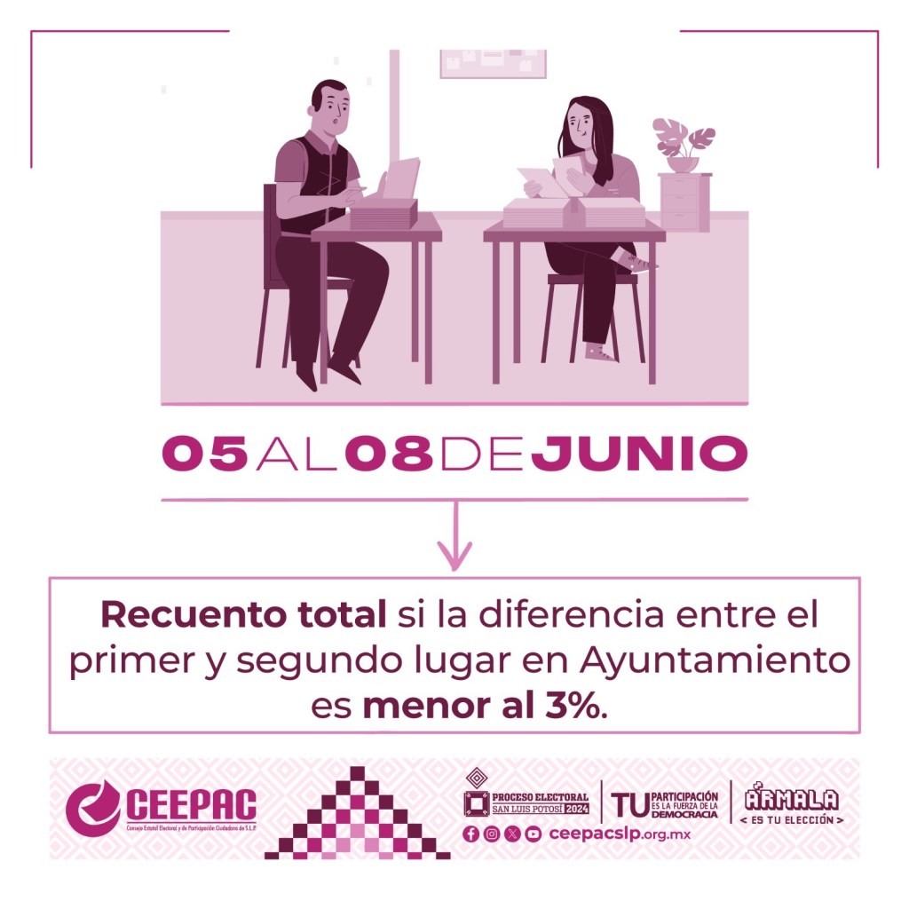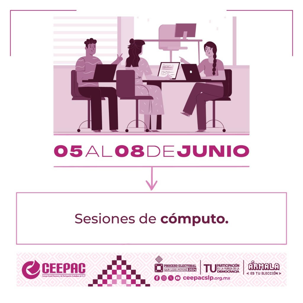Después de una jornada electoral con una participación superior al 60% de la lista nominal en la que prevaleció la tranquilidad y sin incidencias mayores, el Consejo Estatal Electoral y de Participación Ciudadana de San Luis Potosí llevará acabo las Sesiones de Cómputo Municipales y Distritales a partir del día 5 de junio de 2024, en los Comités Municipales y Comisiones Distritales.